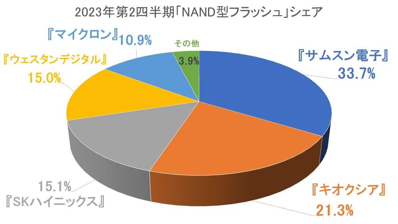 2023年第2四半期時点での、NAND型フラッシュメモリーの世界シェアは以下のようになっています。