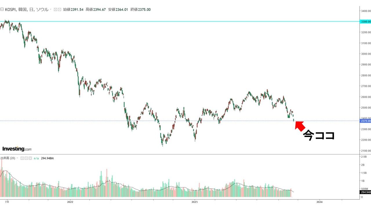 韓国の株式市場が低迷しています。直近の2023年10月20日終値時点で以下のような頭が痛いチャートになっています(チャートは『Investing.com』より引用:日足)。