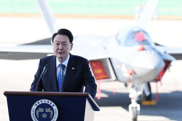 ↑『ソウルADEX』の1シーン。KF-21の前で演説する尹錫悦(ユン・ソギョル)大統領。