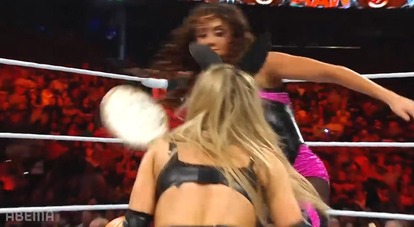 その名も「トリック・オア・トリート・ストリート・ファイト」。バニー姿のナタリアに対しチェルシーはブレット・ハートのコスプレで登場。さらにセコンドのパイパー・ニーヴェンはジム・ナイトハートの髭姿、ナタリアの父親のコスプレで試合前に一本取った形だ。