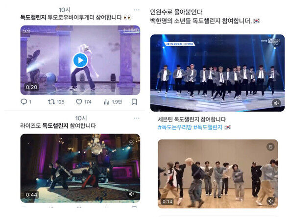 独島チャレンジはそれぞれ異なるダンスを踊るアイドル映像の背景に、「独島は我が領土」がかぶせられている。