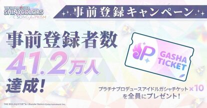 さらに、同タイトルの事前登録者が41.2万人<シャイニー>を突破したことがリリース前日に発表となり、事前に告知されていたガシャ10連分の事前登録報酬「プラチナプロデュースアイドルガシャチケット」のプレゼントも決定している。