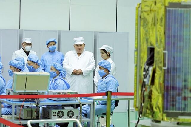 ↑2023年05月17日、ついに完成したという偵察衛星を視察する北の金ちゃんファミリー三代目。