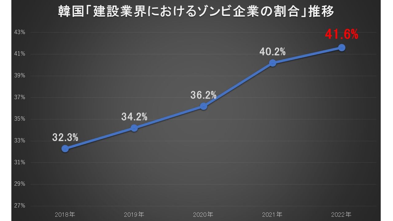 同院の「建設外監査企業の経営実績及び限界企業分析」報告書によると、2022年、国内建設業界(外部監査を受けている企業)でゾンビ企業は929社。業界全体の41.6%となっています。