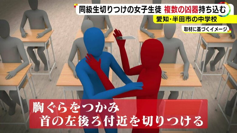 4日、半田市内の中学校で、中学2年の女子生徒(14)が同級生の男子(13)をナイフで切りつけた事件。男子生徒は首の後ろあたりを切り、軽傷を負った。