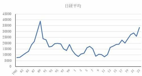 また株価を見ても、日本は1980年代以降6倍程度の変化幅で上昇、下落したのに対して、