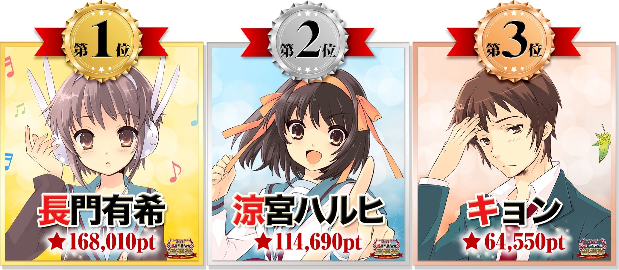 涼宮ハルヒの公式人気投票 1位「長門」2位「ハルヒ」3位「キョン」4位「古泉」5位「