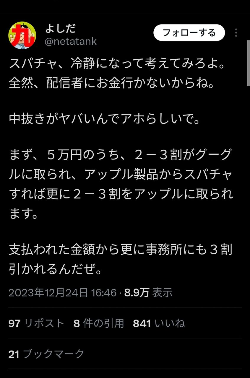 スパチャ、冷静になって考えてみろよ。全然、配信者にお金行かないからね。