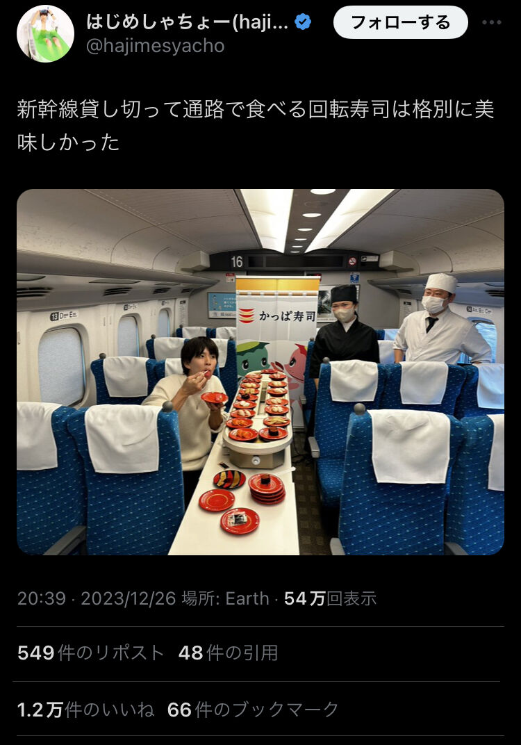 はじめしゃちょー、新幹線を貸し切って回転寿司を食べる