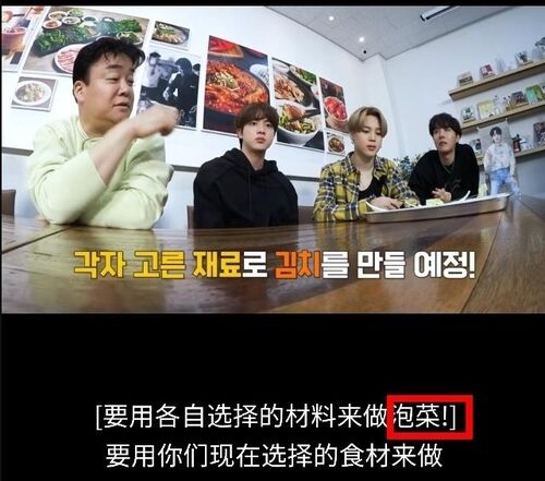 VANKが問題視したのは、BTS(防弾少年団)のリアルバラエティー番組「Run BTS!」の142話(m.vlive.tv/video/251627)。15日に配信されたこの回で、BTSは料理研究家のペク・ジョンウォン氏からキムチを漬ける方法を学んだ。ところが、中国語の字幕でキムチが「泡菜」と表記された。