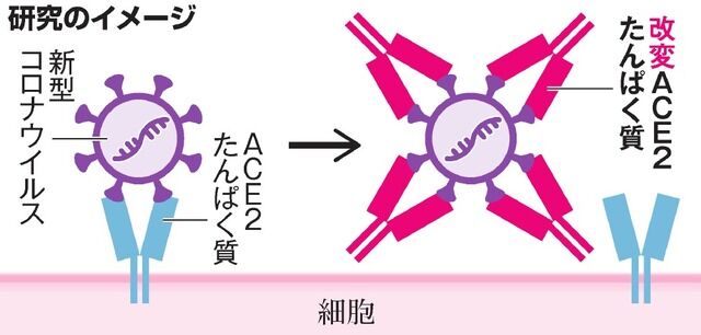 新型コロナウイルスは、細胞表面にある「ACE2」と呼ばれるたんぱく質を「入り口」として細胞に侵入する。グループはACE2を作る遺伝子に変異を入れ、ウイルスに約100倍強力にくっつく改変ACE2たんぱく質を作った。