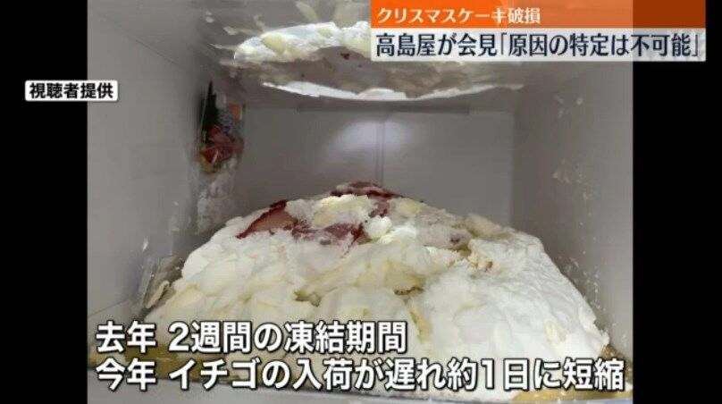 高島屋によりますと、ケーキは2879個販売され、そのうち807個で破損が確認されたということです。ケーキは去年も同じ工場で製造されていて、去年は2週間の凍結期間がありましたが、今年はイチゴの入荷が遅れたため、約1日に短縮されていました。