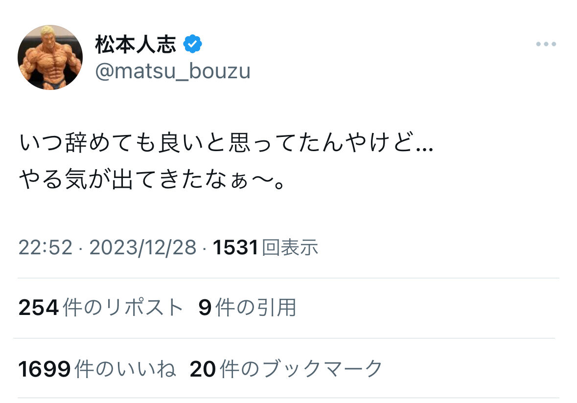 やる気が出てきたなぁ〜。— 松本人志 (@matsu_bouzu) December 28, 2023