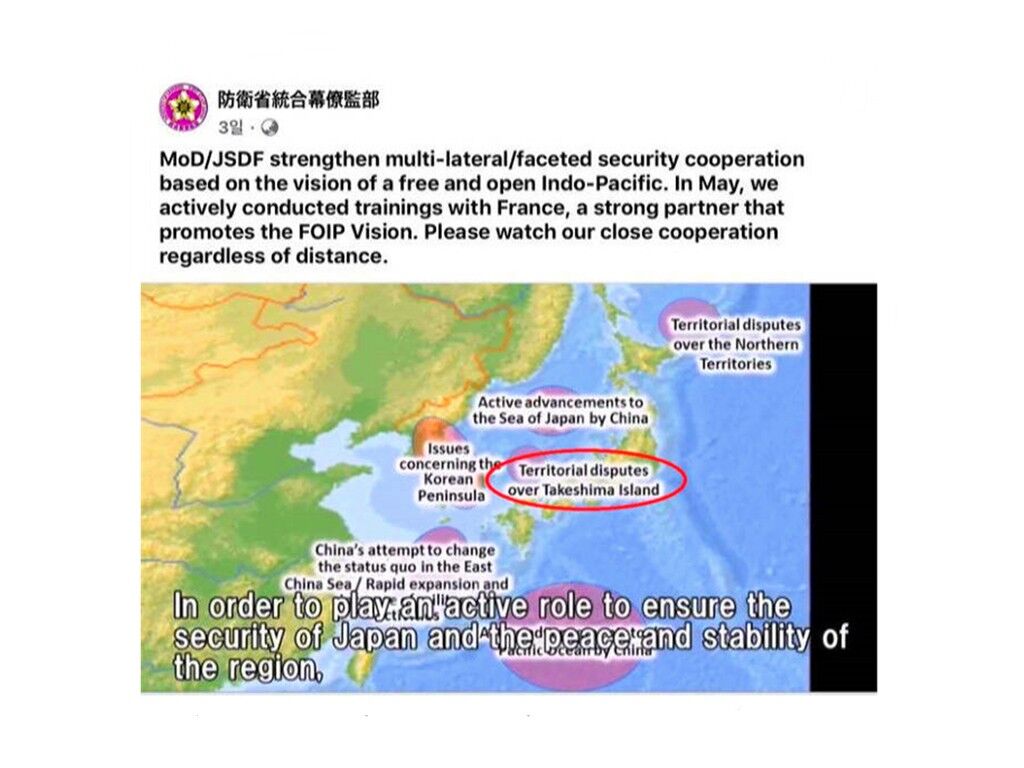 記事によると、防衛省統合幕僚監部は18日、SNSに「自由で開かれたインド太平洋」構想に関する英語とフランス語の映像を掲載した。映像には、日本と国際社会の安全の重要性を強調する内容と共に日本周辺の地図が登場し、竹島の部分に「Territorial disputes over Takeshima Island(竹島領土問題)」と書かれていたという。これについて記事は「韓国との領土問題が日本と東南アジア、国際社会の平和・安定・繁栄を脅かす要素であるかのような印象を与えている」と指摘している。