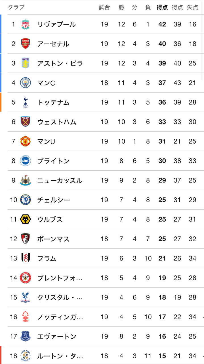 【速報】プレミアリーグ順位表、前半戦の王者決定!!!!