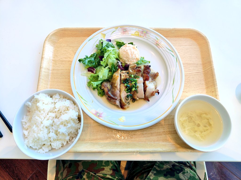 ご飯に野菜、ポテトサラダ、鶏肉のソテー、卵スープの優しいメニューだ。物価高が叫ばれているなか、学食のようなロープライスで豪華食事が提供されていた。