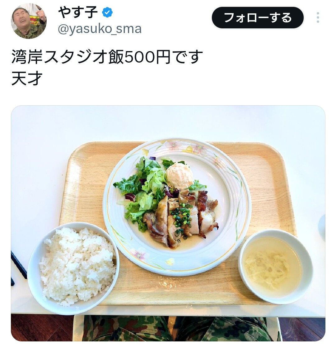 自衛官芸人のやす子が6日、自身のXを更新。フジテレビ湾岸スタジオの食事を紹介し反響を集めている。