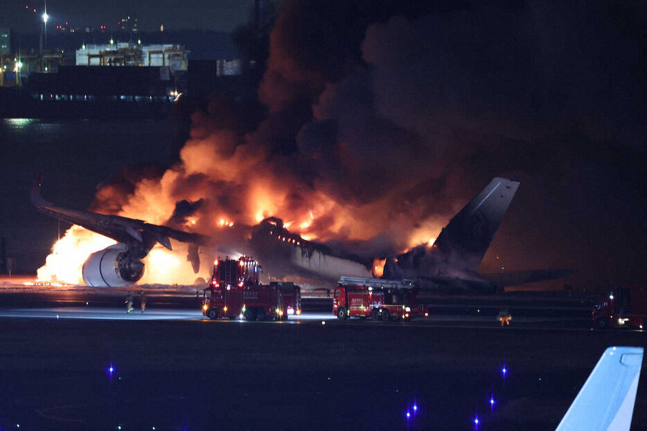 日航機の機体が2日、羽田空港で炎上した。午後6時前に炎を上げながら滑走路を走る期待が目撃されている。