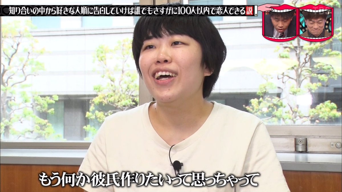 知り合いの中から好きな人順に告白していけば、誰でもさすがに100人以内で恋人できる説 ほしのディスコにフラれたポンループのアミが企画を引き継ぎ今回は挑戦!知り合いの中から目当ての男性への告白を成功させ…ついにカップル誕生となるのか?#水曜日のダウンタウン #tbs— 水曜日のダウンタウン (@wed_downtown) June 23, 2021