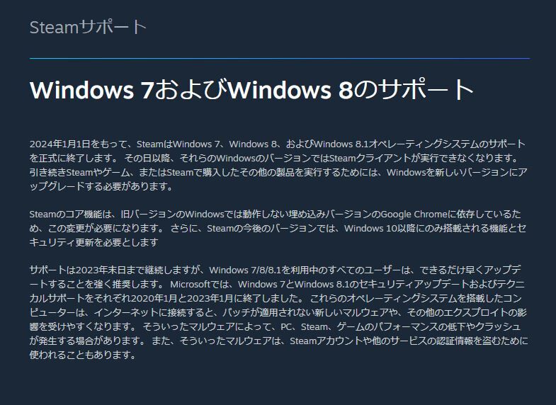 さらに、Steamの今後のバージョンでは、Windows 10以降にのみ搭載される機能とセキュリティ更新を必要とします