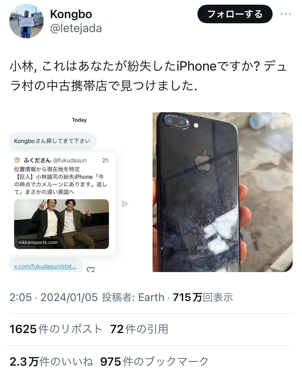 【速報】巨人小林誠司のiPhone、カメルーンで発見か