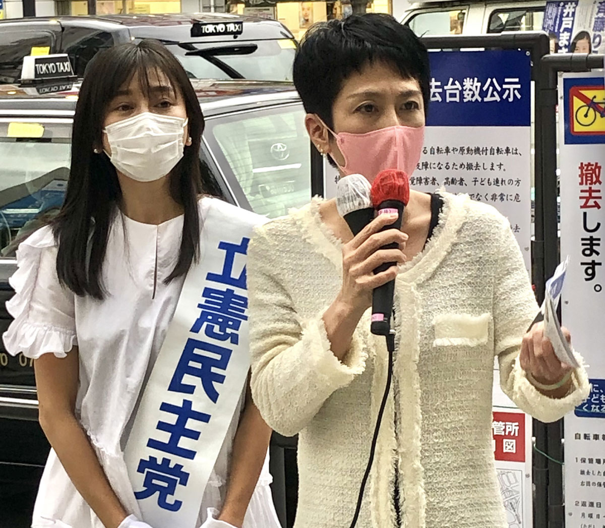 JR蒲田駅で行われた都議会議員選挙(25日告示、7月4日投開票)に出馬する〝筆談ホステス〟斉藤りえ氏(37)の街頭演説会に参加。蓮舫氏は立民結党以来、初めてとなる都議選の勝利に向けて気合十分だった。