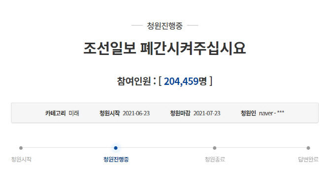 25日、大統領府の国民請願のホームページを見ると‘朝鮮日報を廃刊させてください’というタイトルの請願には、この日午後4時15分時点で20万4459人が同意した。この請願は23日に提出されたもので、3日間で大統領府の答弁基準を満たした。