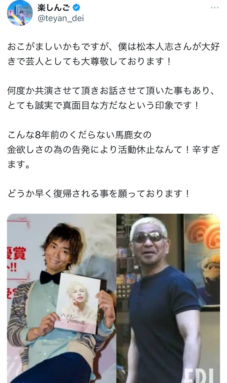 金欲しさの為の告発により活動休止なんて!辛すぎます。… pic.twitter.com/LWb5A43zrX— 楽しんご (@teyan_dei) January 9, 2024