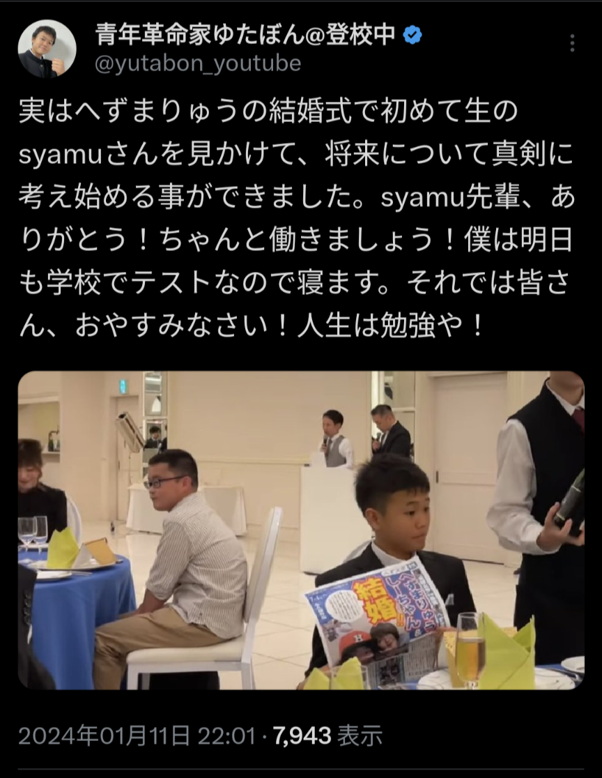 実はへずまりゅうの結婚式で初めて生のsyamuさんを見かけて、将来について真剣に考え始める事ができました。syamu先輩、ありがとう!ちゃんと働きましょう!僕は明日も学校でテストなので寝ます。それでは皆さん、おやすみなさい!人生は勉強や! pic.twitter.com/51ztqjqVCk