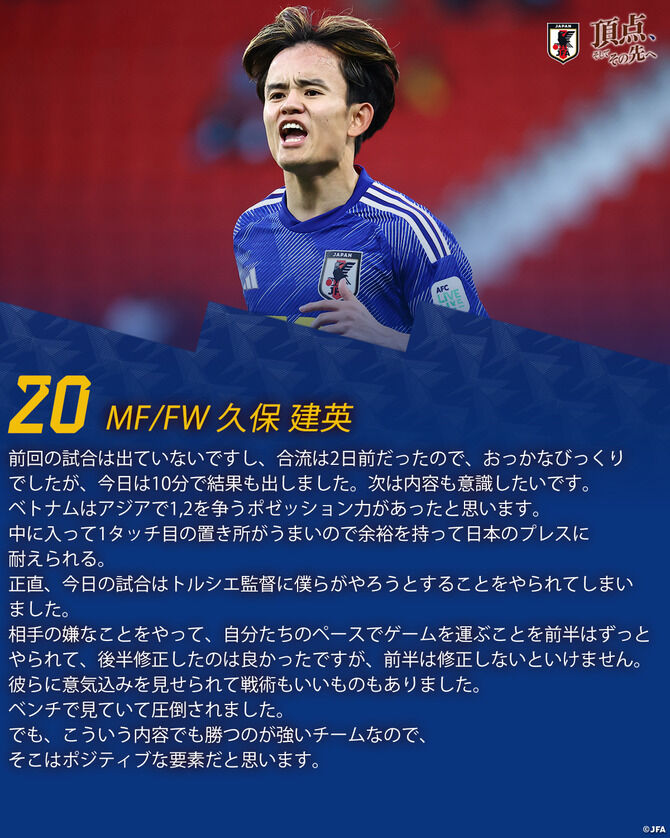 「正直、トルシエ監督に僕たちがやろうとしてることをやられた」と久保。「相手の嫌なことをやって自分たちのペースでゲームを運ぶということを前半はずっとやられてた。後半は修正できて良かったですけど前半のうちに修正しないといけない。ベンチで見ていてびっくりじゃないけど圧倒されました」とベトナムの印象を語った。