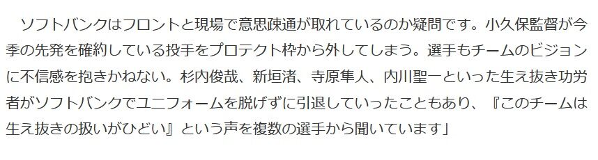 杉内俊哉、新垣渚、寺原隼人、内川聖一といった生え抜き功労者がソフトバンクでユニフォームを脱げずに引退していったこともあり、