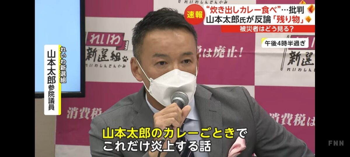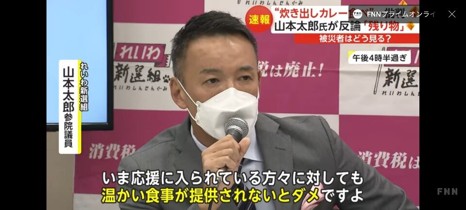 山本太郎さん「被災地に応援へ行く方にも温かい食事が提供されて当然。たかがカレーで炎上はおかしい」