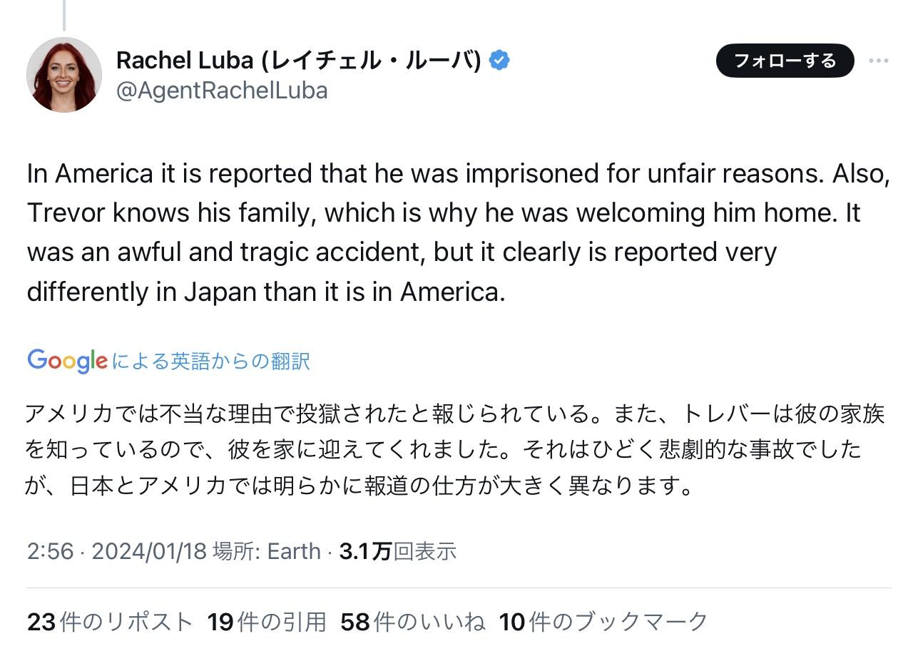 「アメリカでは彼は不当な理由で投獄されたと伝えられている。またトレバーは彼の家族と面識があったため、迎え入れるようなメッセージを送った。ひどく悲劇的な事故だったが、日本とアメリカで明らかに報道が違う。」 https://t.co/Xh3gK00lzH