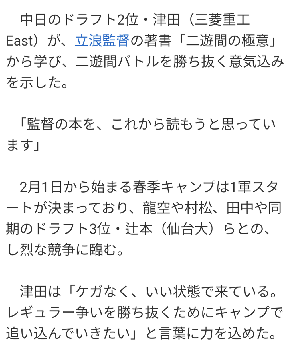 中日ドラ2・津田「監督の本をこれから読もうと思っています」
