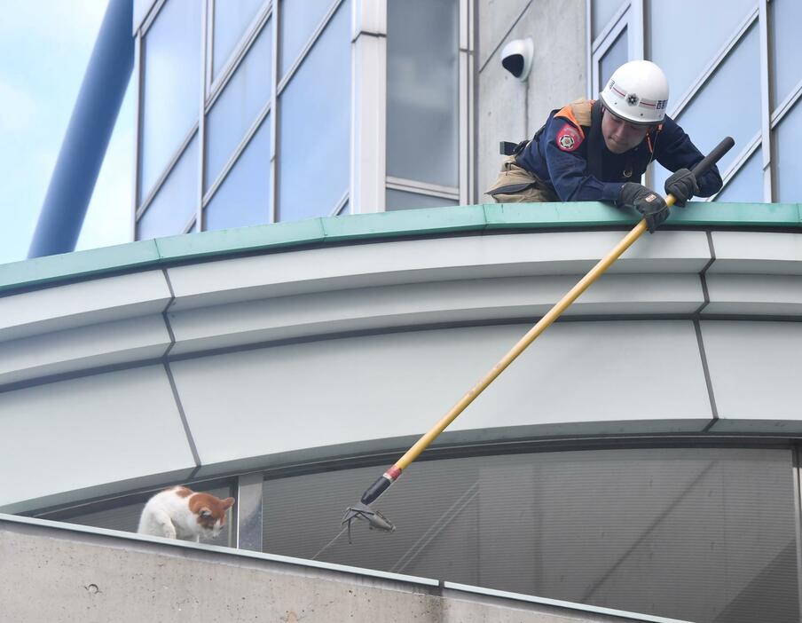 午後2時55分、猫は救助の網をかいくぐるように落下し、ヒヤッとさせられたが、元気に猛スピードで逃げていった。消防団員は「(こうしたケースは)たまにあります、猫は」と話した。