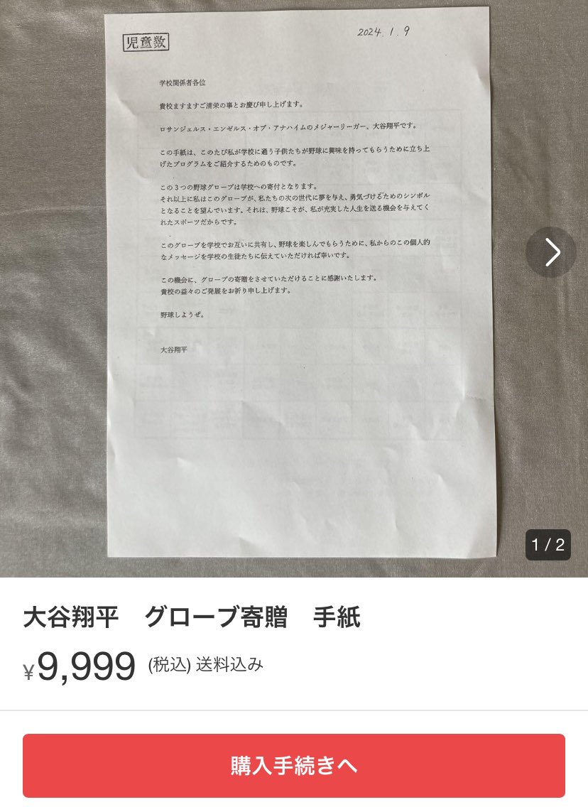 【悲報】大谷翔平さんグローブ寄贈のお手紙、メルカリに出品されてしまうWWWWWWWWWW