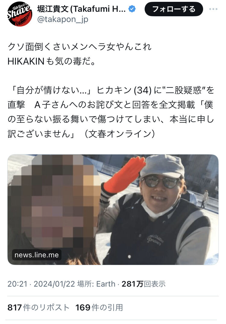 堀江貴文「クソ面倒くさいメンヘラ女やんこれ。ヒカキンも気の毒だ。」