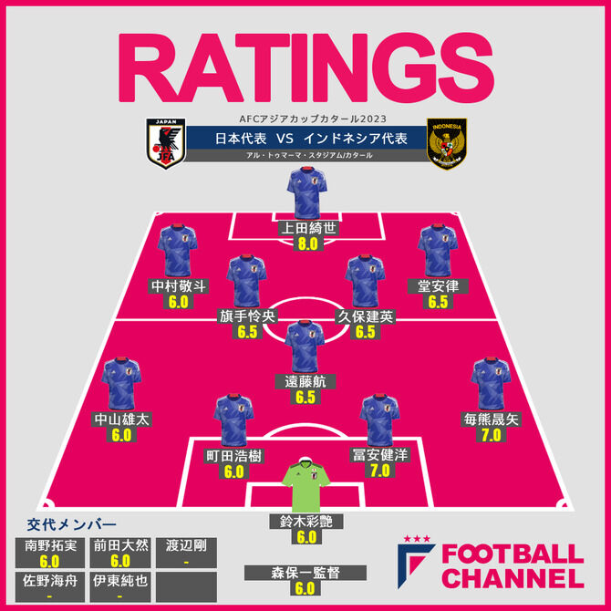サッカー日本代表は24日、AFCアジアカップカタール2023・グループリーグD組第3節でインドネシア代表と対戦し、3-1で勝利。この試合で森保ジャパンのパフォーマンスはどうだったのだろうか。フットボールチャンネルでは、インドネシア代表戦に出場した選手(出場時間の短い選手は除く)、監督のパフォーマンスをどこよりも早く採点する。
