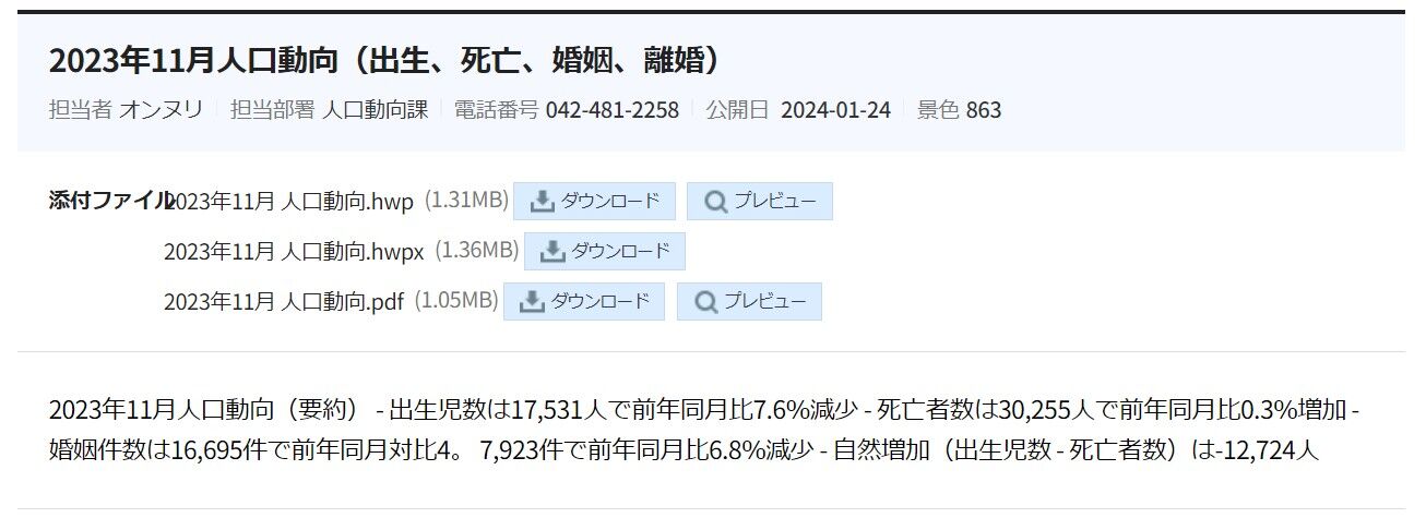 2024年01月24日、韓国の統計庁が「2023年11月人口動向(出生、死亡、婚姻、離婚)」のデータを公表しました。