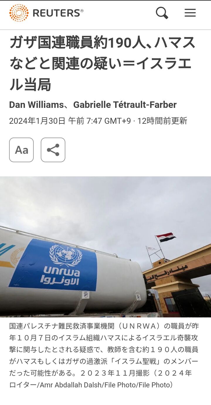 ガザ国連職員約190人、ハマスなどと関連の疑い=イスラエル当局