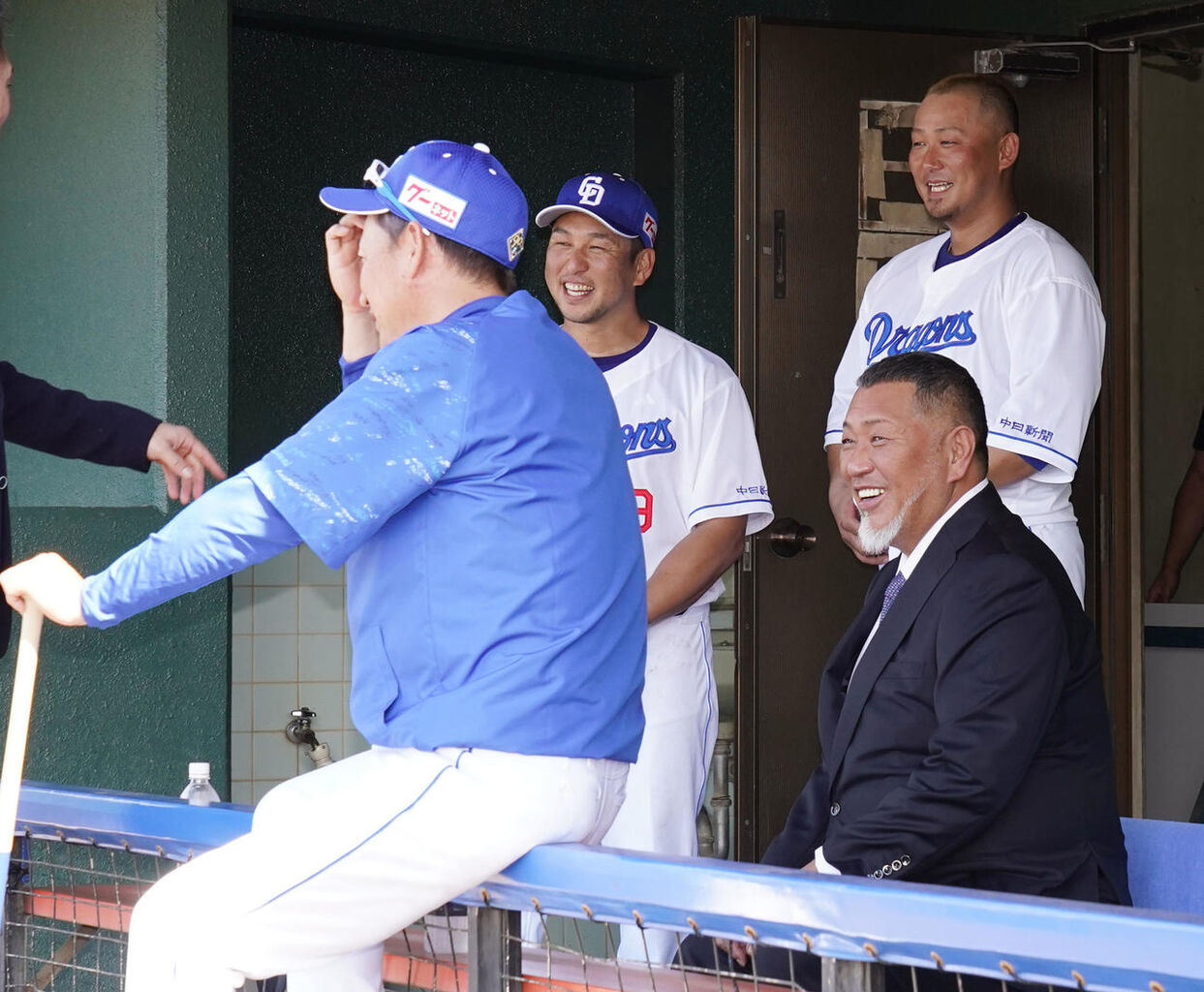 中日ドラゴンズ 清原和博氏が3年連続3度目のキャンプ視察 PL学園後輩の立浪監督が指揮 中田翔・中島宏之と談笑も