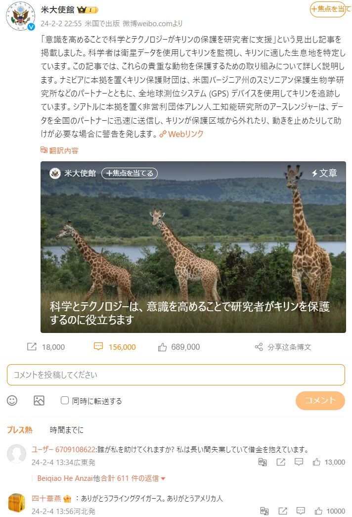 同日、在中国アメリカ合衆国大使館の『Weibo』公式アカウントは「キリンの保護」についての投稿も行ったのですが、これにも大量のコメントをつきました。