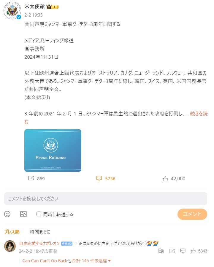 ↑「ミャンマー軍事クーデター3周年に関する投稿」でしたが、これに大量のコメントがつきました。