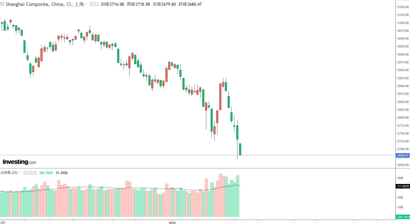 合衆国からすれば「知らんがな」という話なのですが、以下のように中国株式市場は絶賛下落中です(チャートは『Investing.com』より引用:上海総合/日足/2024年02月05日13:22現在)。