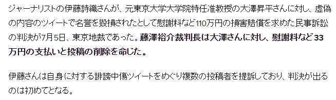 ツイッターに虚偽の投稿をされて名誉を傷つけられたとして、ジャーナリストの伊藤詩織さん(32)が、大沢昇平・元東京大大学院特任准教授に110万円の損害賠償を求めた訴訟の判決で、東京地裁(藤沢裕介裁判長)は6日、33万円の支払いを命じた。