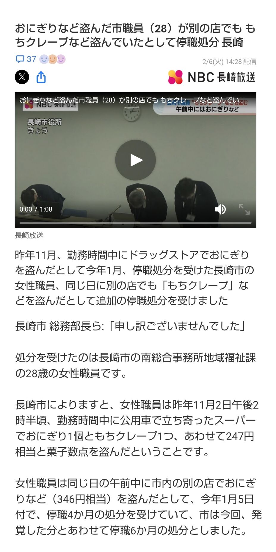 【長崎】おにぎりを盗んで4ヶ月停職の女子公務員(28)、もちクレープを追加