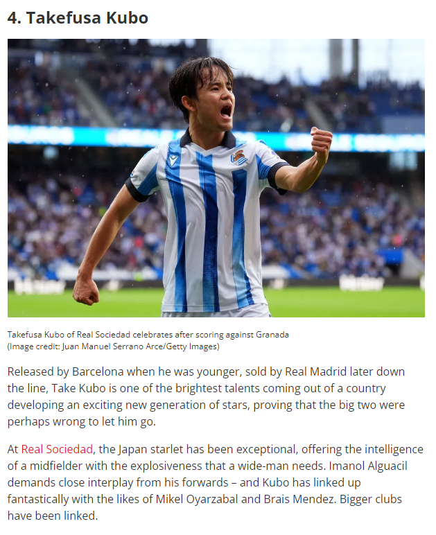久保がウインガーランキングで世界4位だってさスペインじゃなくイギリスのメディアで選ばれたのがやばい、三笘は残念ながら選外