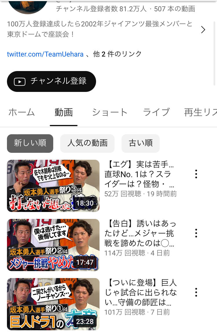 【朗報】上原浩治さん、日本一のYouTuberの再生数を超えてしまう