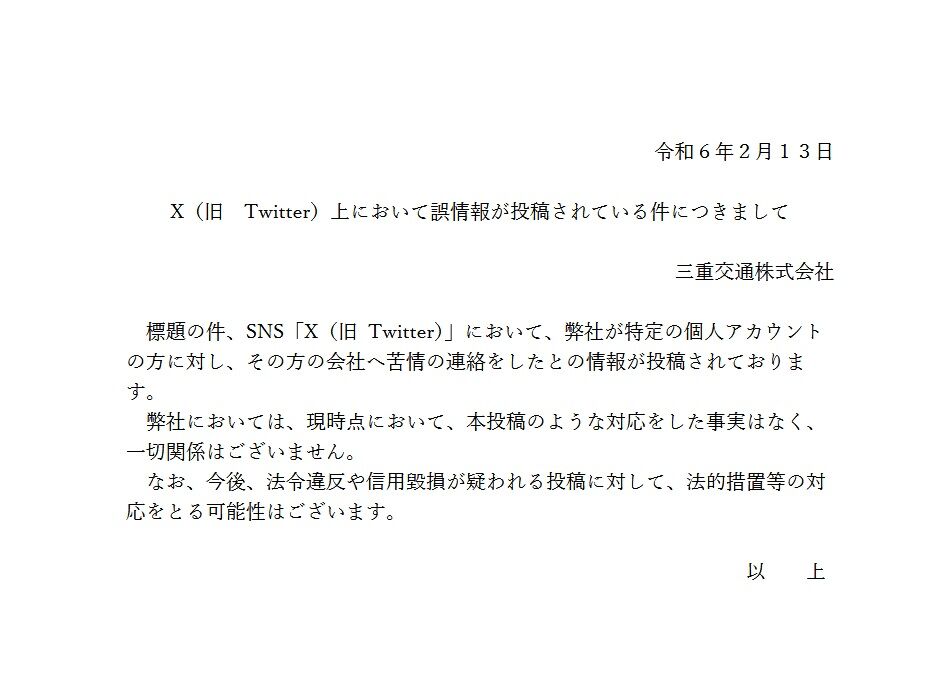 X上にて、弊社が、特定の個人アカウントの方に対し、その方の会社へ苦情の連絡をしたという情報が投稿されておりますが、本投稿のような対応をした事実はなく、一切関係はございません。