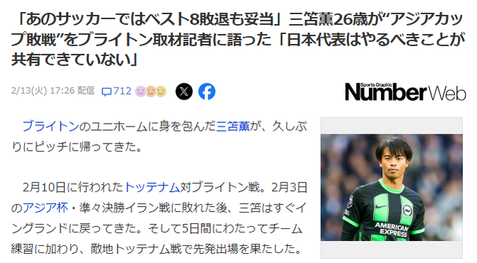これヨーロッパのコーチ陣の仕事と比べて日本代表のコーチ陣のレベルの低さに失望してるとかそんな感じなのかね三笘は言葉を選んでるが記者はコーチ陣のせいにしたいって感じだなhttps://number.bunshun.jp/articles/-/860632?page=1